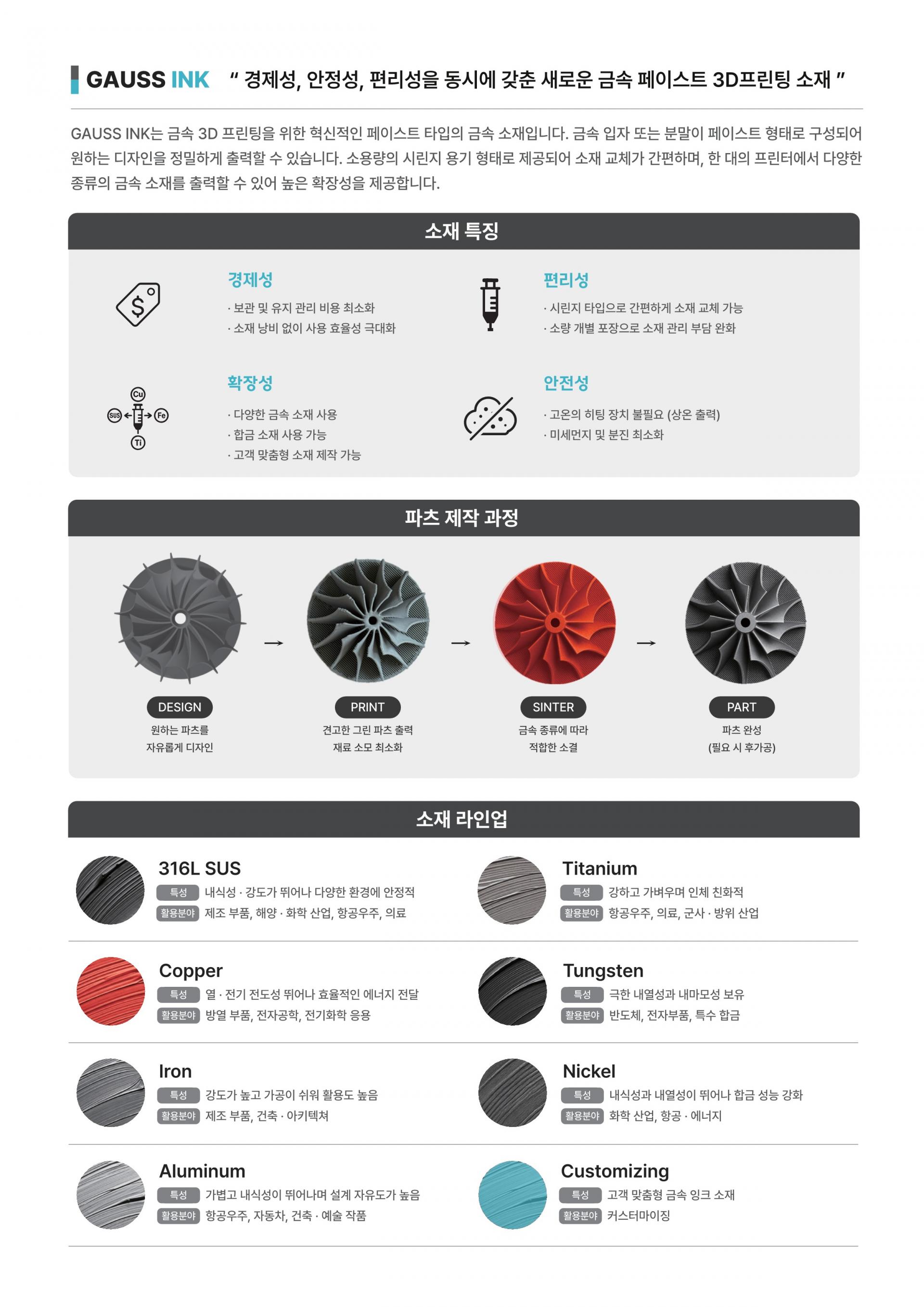 안전하고 간편한 작업 환경을 제공하며, 다양한 산업 분야에서 활용 가능한 확장성까지 갖춘 GAUSS INK 316L SUS는 금속3D프린팅 시장의 새로운 장을 여는 혁신적인 소재입니다.