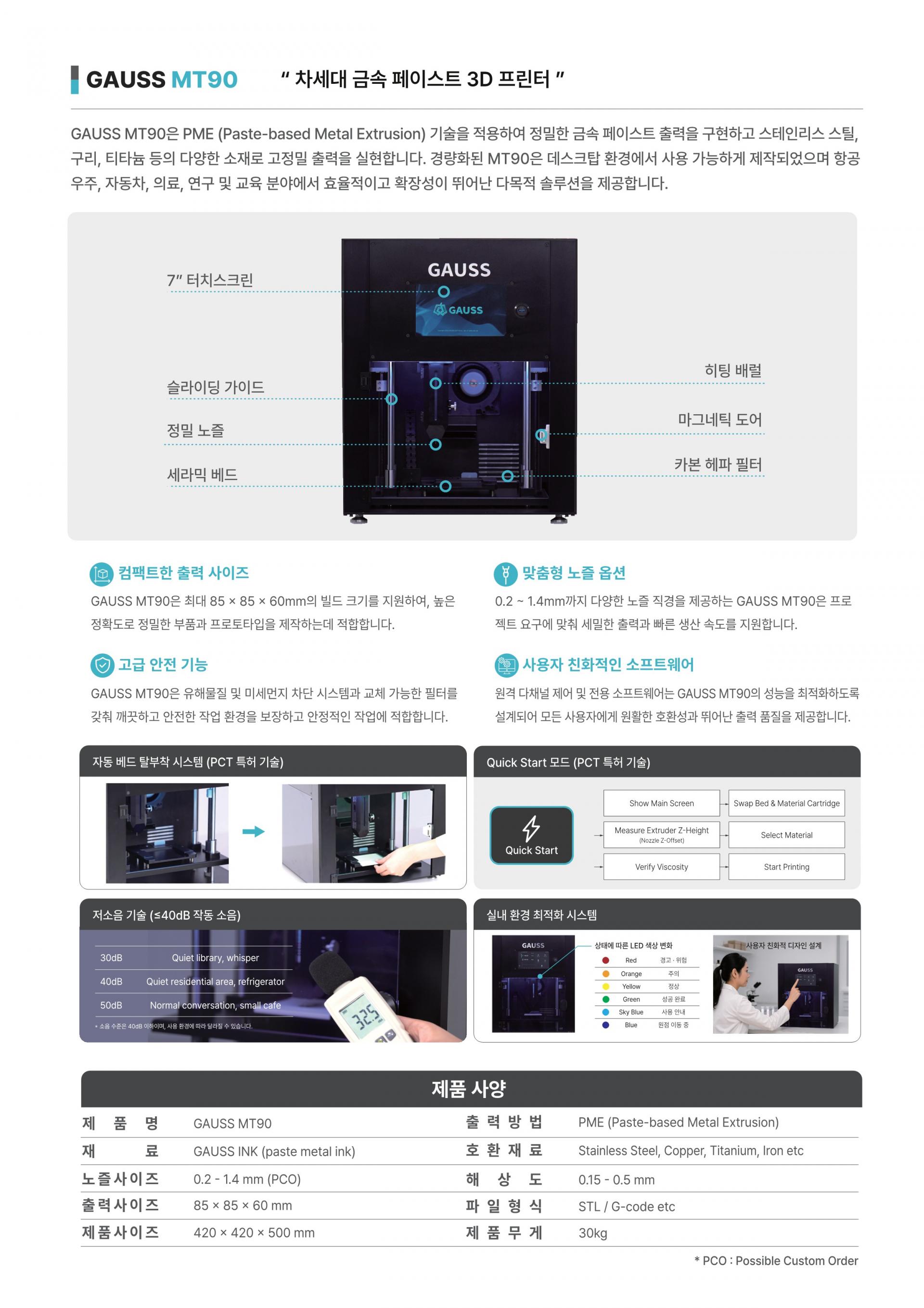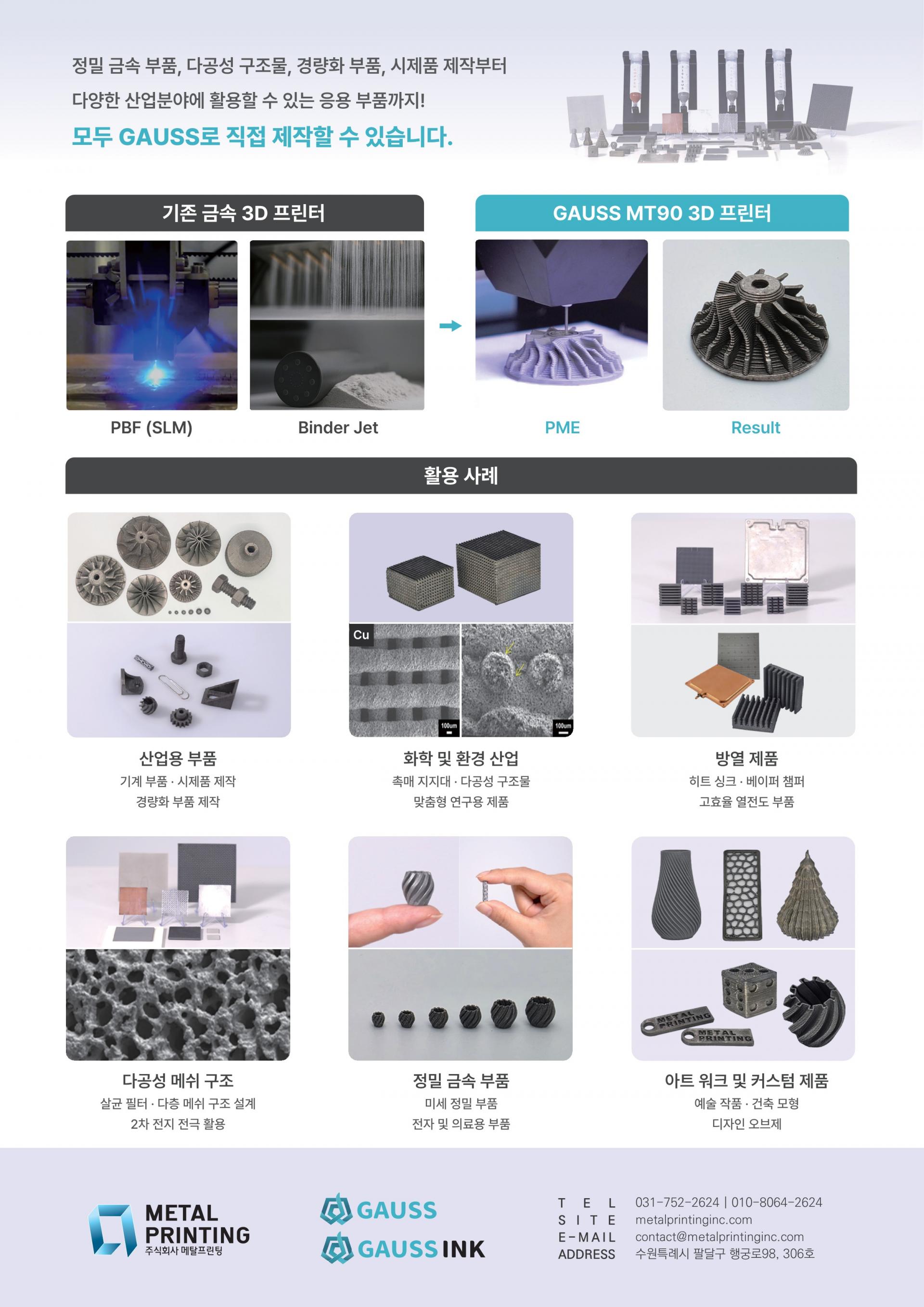 특히, GAUSS PME(Paste-based Metal Extrusion) 기술과 완벽히 호환되어 복잡한 형상과 미세 구조를 손쉽게 구현할 수 있으며, 소결 공정 후에는 순수 금속 특성을 가진 부품을 생산할 수 있습니다.